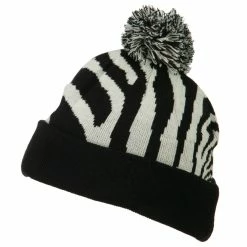 Stylish knitted beanie hat featuring zebra print around the crown of beanie.