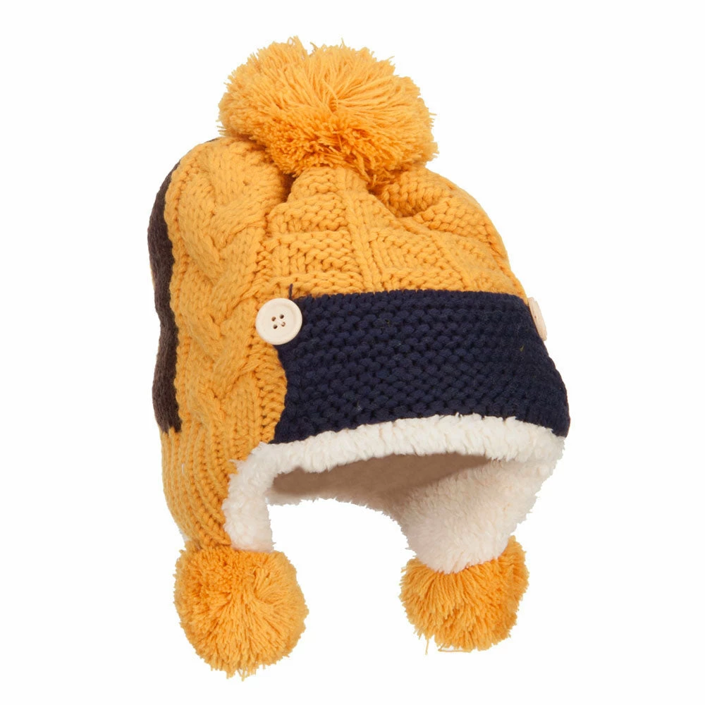 Ear flaps are accented with pom poms.
