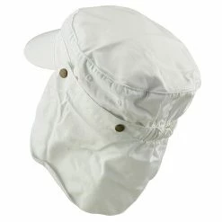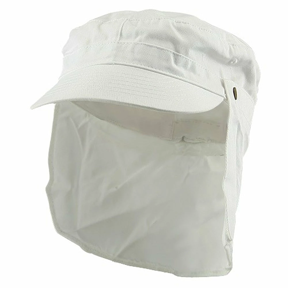 You don’t have to sign your life away to get that fashionable army style that’s all the rage right now. Instead try your luck in our newArmy Cap with Flap. Made from a unique blend of cotton and polyester, this cap offer you not only great style but practical use as well. Featuring a front bill measuring 2 1/4″ long and a 6 1/4″ long and 14″ wide removable snap neck flap, you never have to worry about any of mother nature’s elements while sporting this cap. Made from a soft and plush material, the 3 paneled crown measures 3 inches deep, giving you that snug and tight fitting military look.Fitted in the back with a elastic band closure, this hat is a perfect fit for almost anyone. So don’t go to boot camp to get that look you desire, why stand in attention when you can have other staring at you in attention. Available in White, Khaki,Camouflage and New Desert.