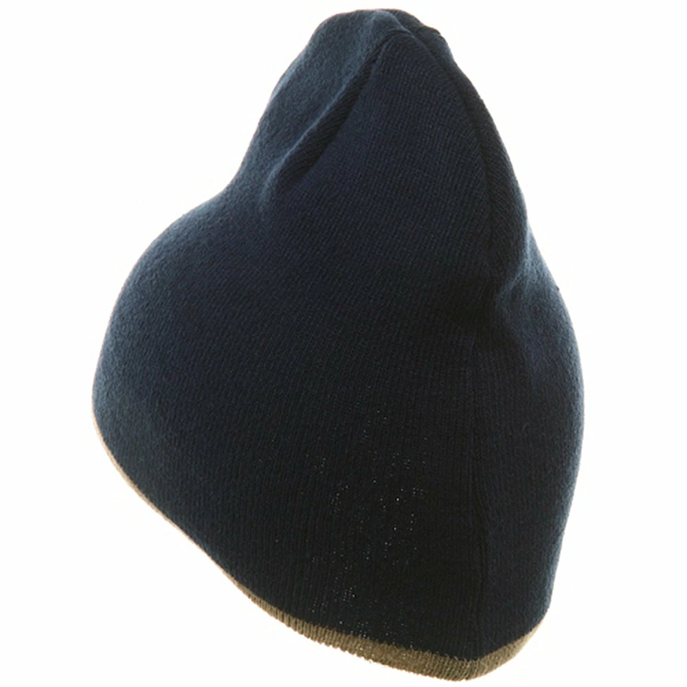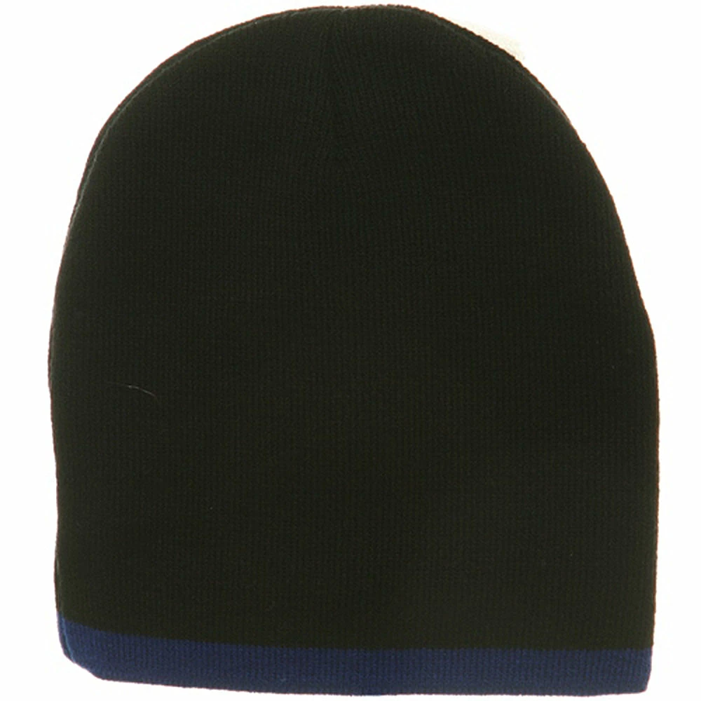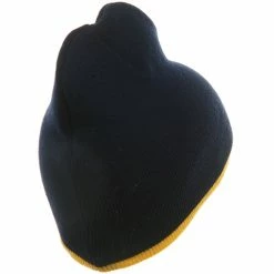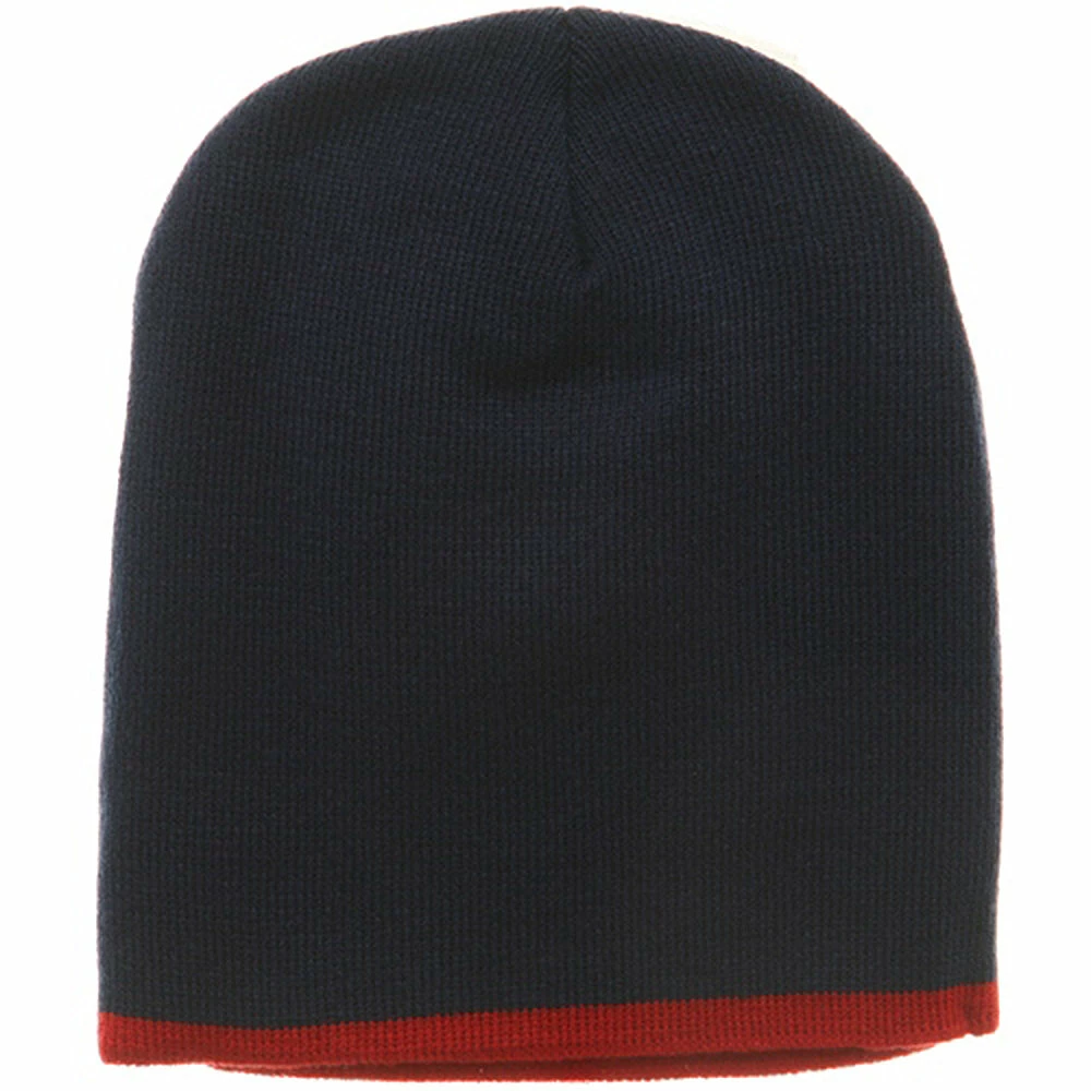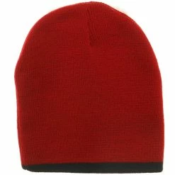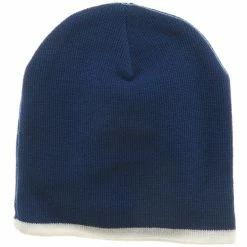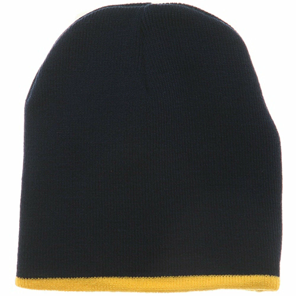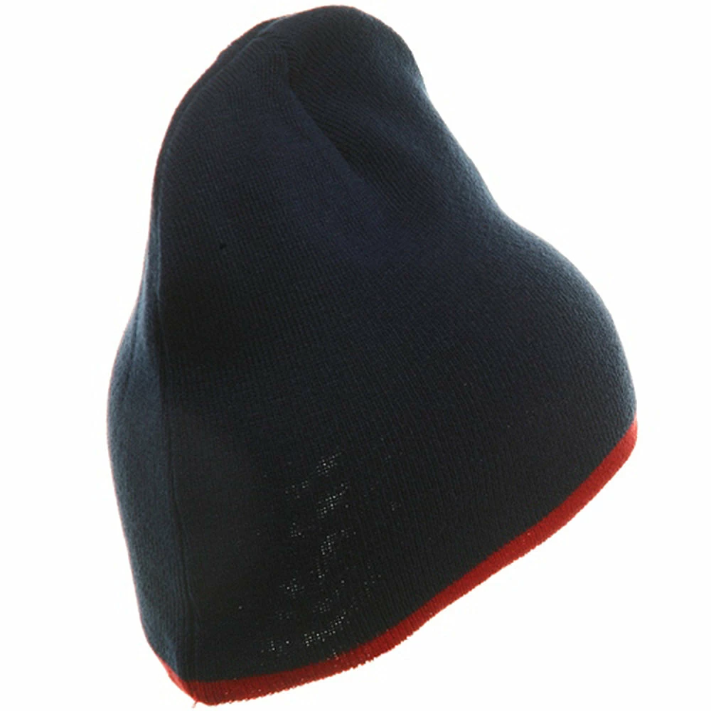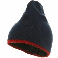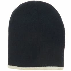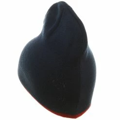 Double layered for extra warmth, this durable, basic solid beanie with contrasting trim detail will comfortably see you through the winter months in your favorite color combination. Constructed out of 1 panel of knit acrylic, in a fine tight weave to keep the weather out and to keep your warmth in, this hat offers a lot of stretch and flexibility, for a great fit on any head. The crown has 1 seam running down the back, for a clean round shape, and the hat is double layered for added insulation. The beanie is rich navy blue in color with white trim at the opening for contrast. Offered in many colors, you’re sure to find the color combo that corresponds to your favorite school or team colors.
