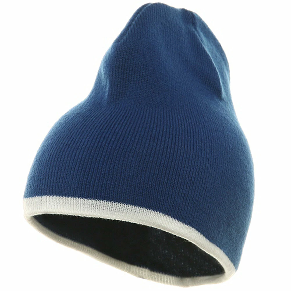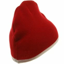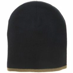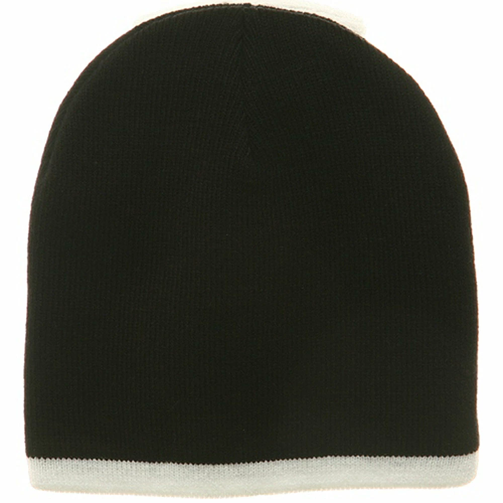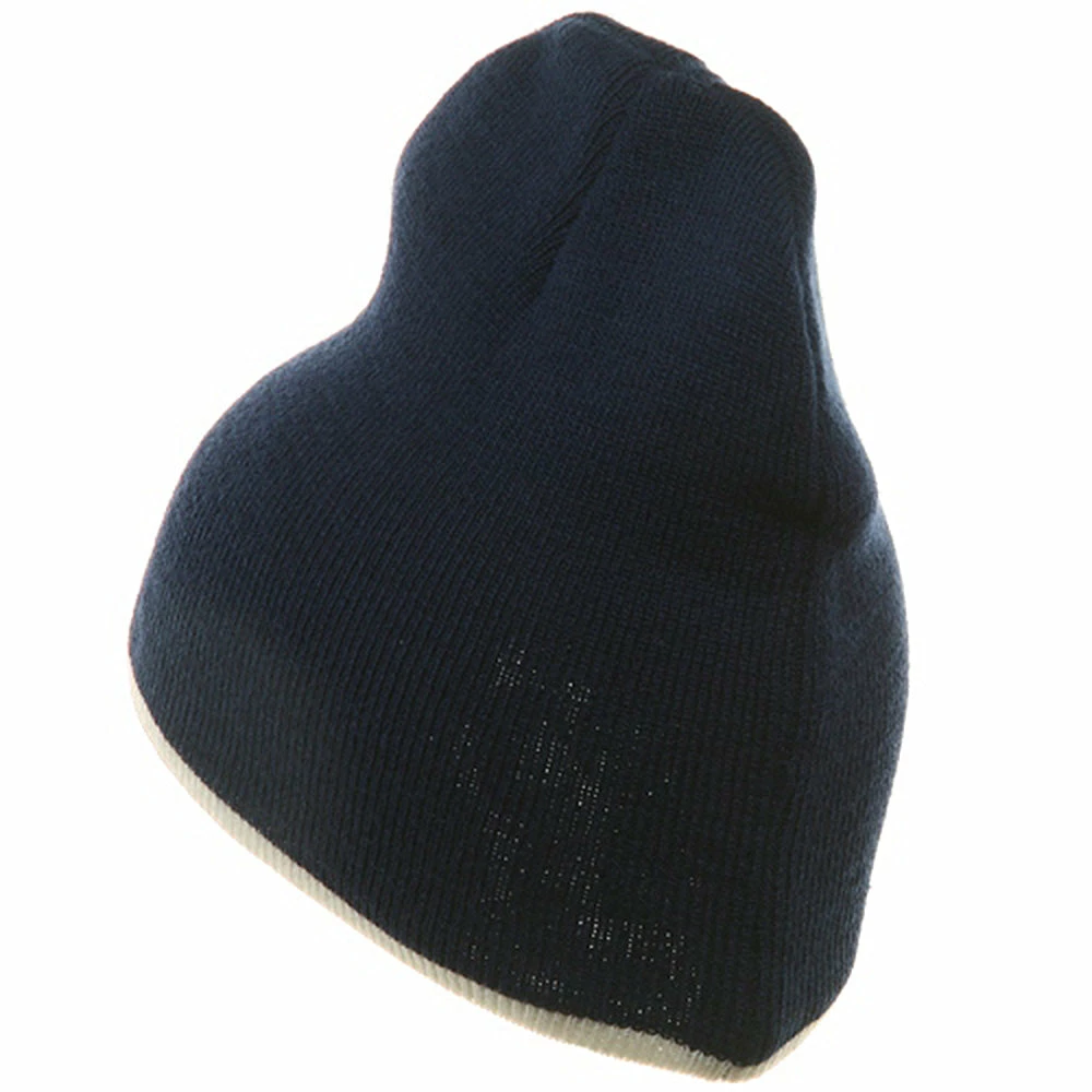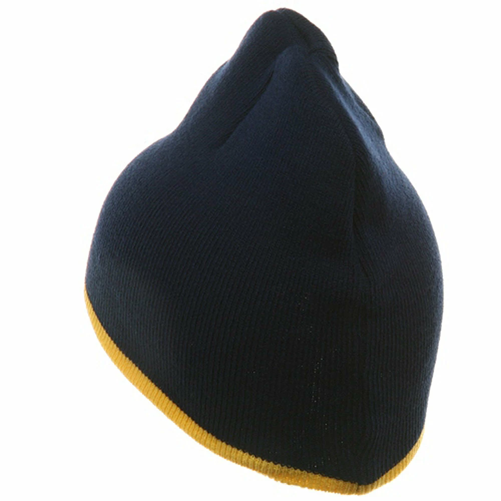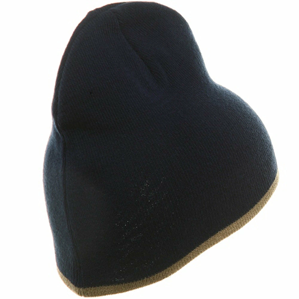 Double layered for extra warmth, this durable, basic solid beanie with contrasting trim detail will comfortably see you through the winter months in your favorite color combination. Constructed out of 1 panel of knit acrylic, in a fine tight weave to keep the weather out and to keep your warmth in, this hat offers a lot of stretch and flexibility, for a great fit on any head. The crown has 1 seam running down the back, for a clean round shape, and the hat is double layered for added insulation. The beanie is rich navy blue in color with white trim at the opening for contrast. Offered in many colors, you’re sure to find the color combo that corresponds to your favorite school or team colors.