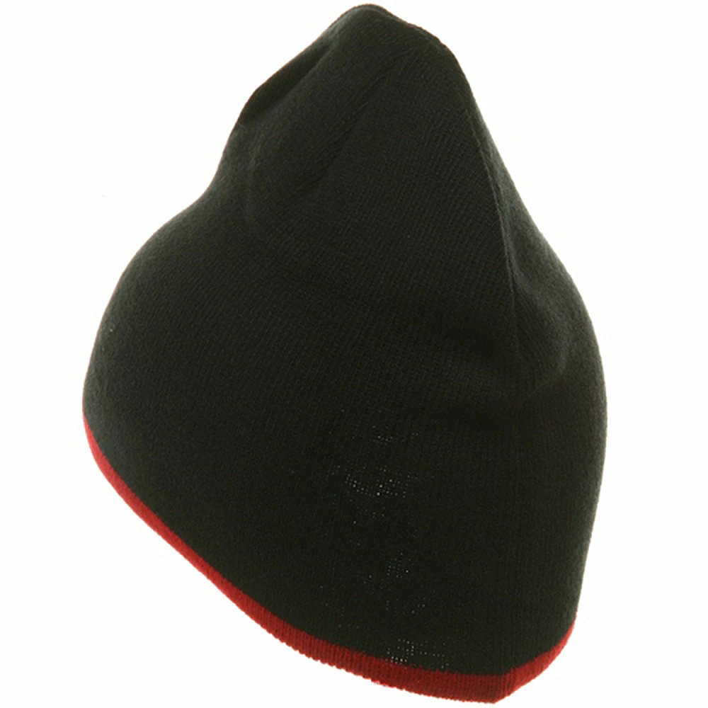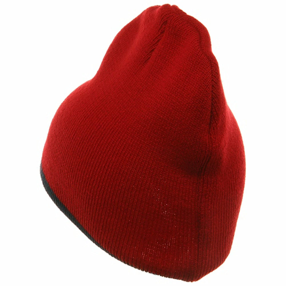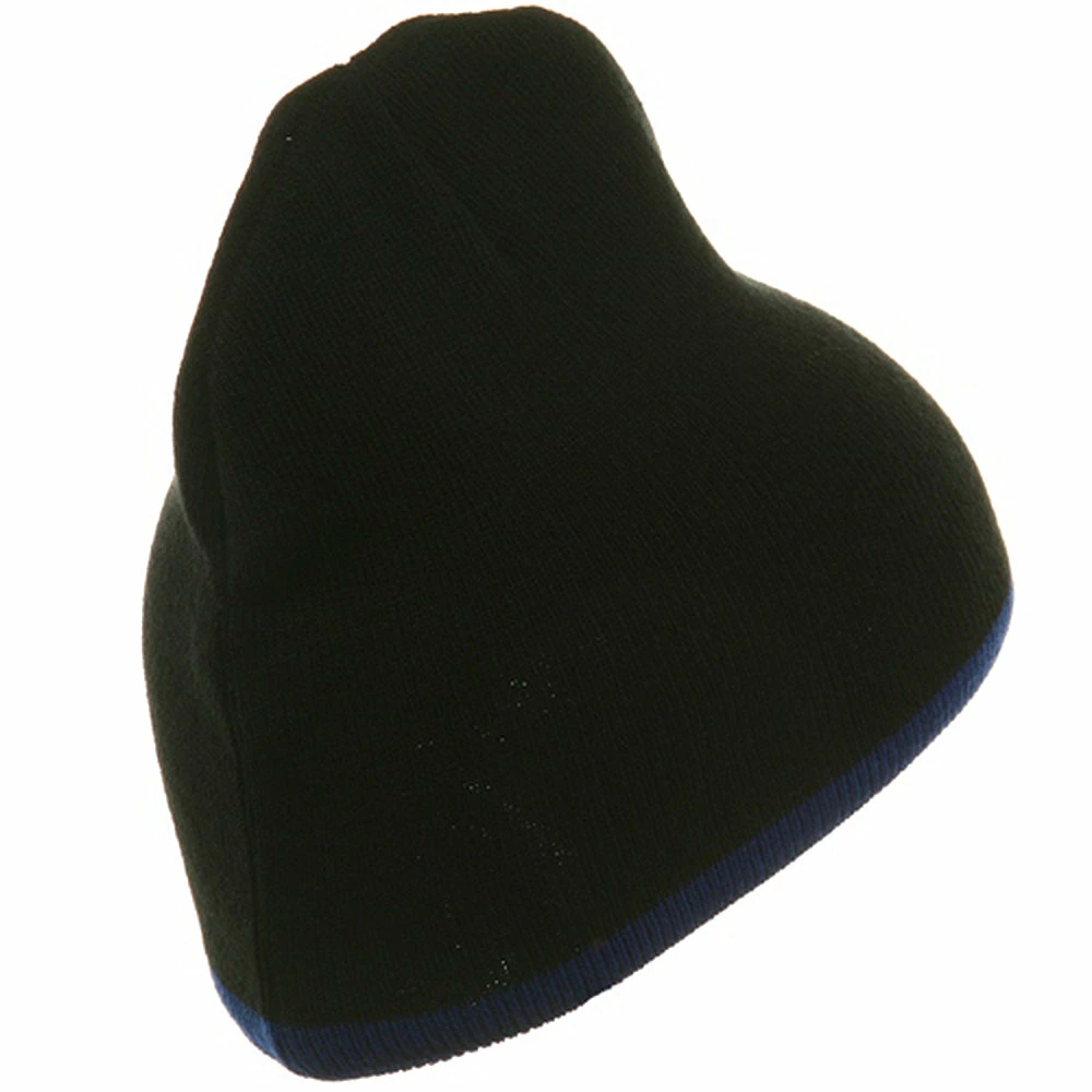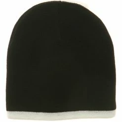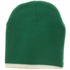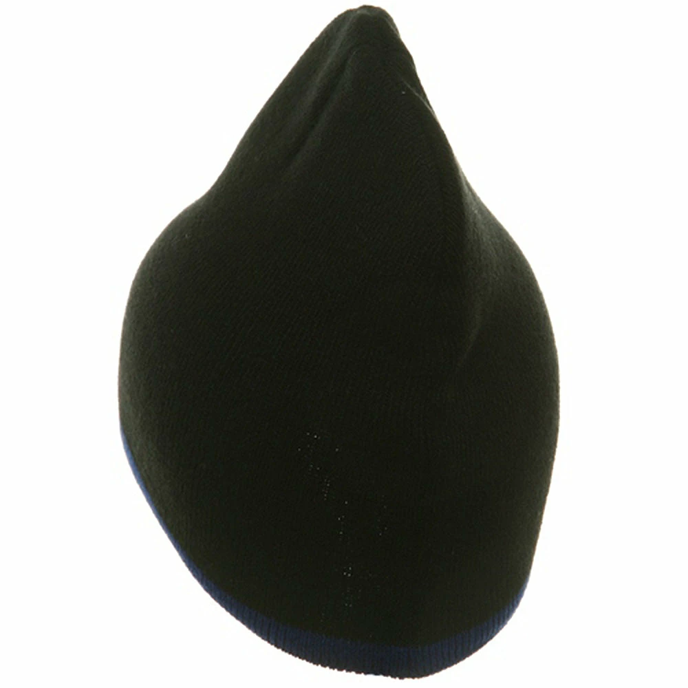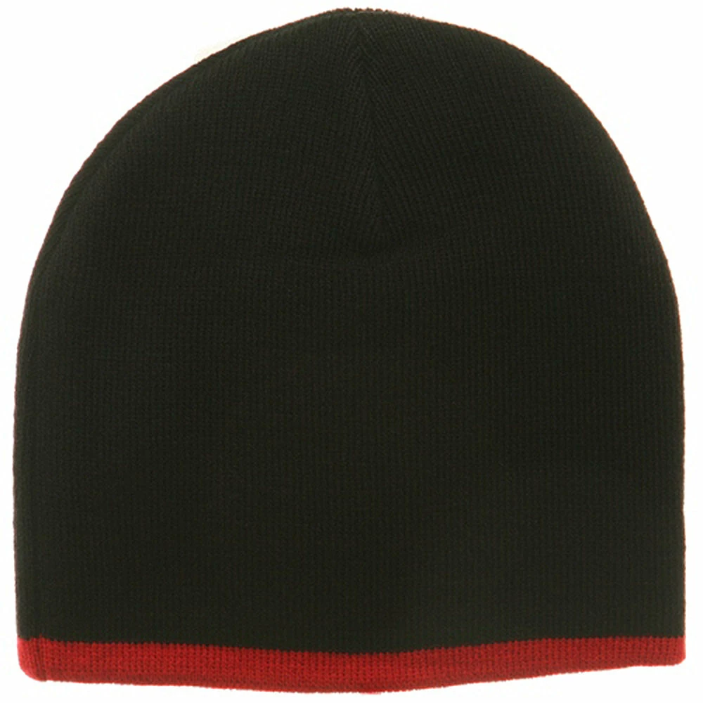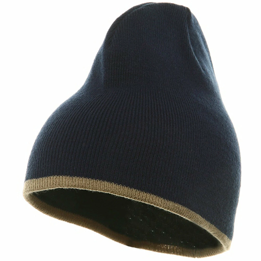 Double layered for extra warmth, this durable, basic solid beanie with contrasting trim detail will comfortably see you through the winter months in your favorite color combination. Constructed out of 1 panel of knit acrylic, in a fine tight weave to keep the weather out and to keep your warmth in, this hat offers a lot of stretch and flexibility, for a great fit on any head. The crown has 1 seam running down the back, for a clean round shape, and the hat is double layered for added insulation. The beanie is rich navy blue in color with white trim at the opening for contrast. Offered in many colors, you’re sure to find the color combo that corresponds to your favorite school or team colors.