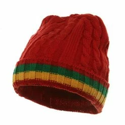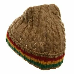 Thick and chunky with an ample cuff for added style, thisTwo Tone Cuff Twister Ski Beanie will keep you comfortably warm throughout the winter.The round crown is constructed out of 1 panel of soft cable knit, giving this hat an ultimate amount of stretch and flexibility to fit every head shape.The 2 inches cuff can be adjusted to meet your need for coverage.Also, on the cuff of this beanie, three rasta stripes are accented with colors of red, yellow and green.This lightweight basic beanie will keep the cold weather out while keeping your warmth under your hat with classic style.Available in grey and khaki beanies with rasta stripes on the cuff.