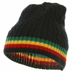 Cables and ribs adorn this soft knit, adding tactile texture to its soft navy color.Constructed out of 1 panel of medium acrylic cable knit fabric, thisTwister Skully Beanie offers a smooth round shape with enough stretch and flexibility to fit children as well as adults, with ease.The opening of this hat is accented with rasta stripes of green, yellow and red.It is lightweight and easily packed, this hat is ideal for travel with its insulating softness.Available in 3 appealing colors with rasta stripes accented on this beanie.