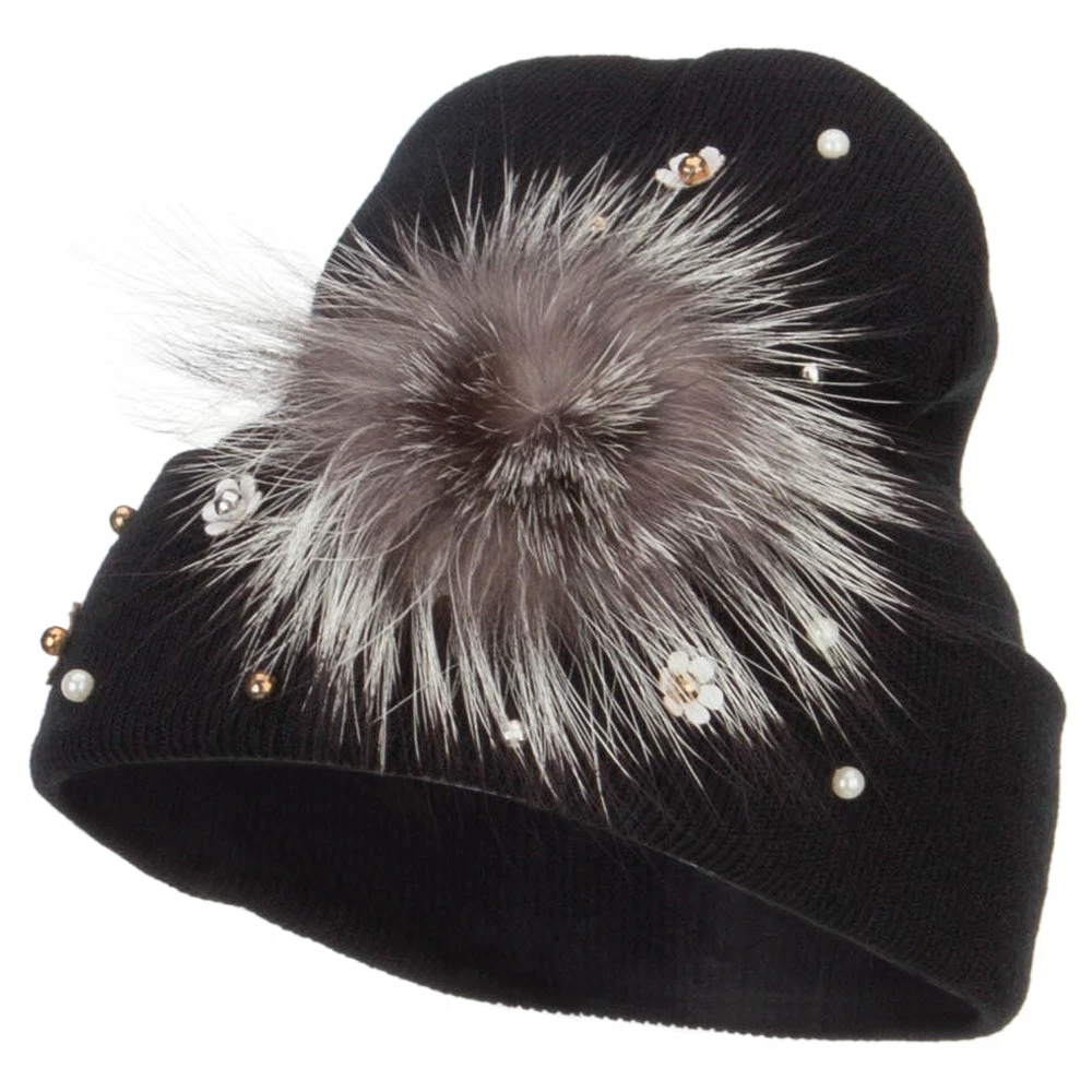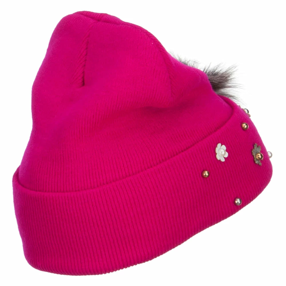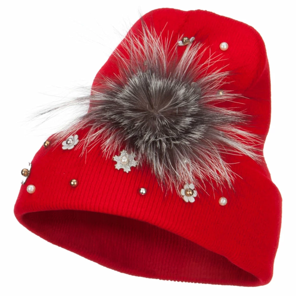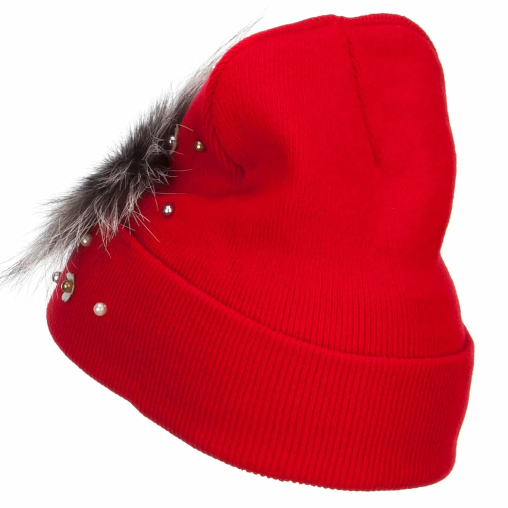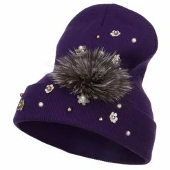 Fur accented knit long beanie hat for ladies.