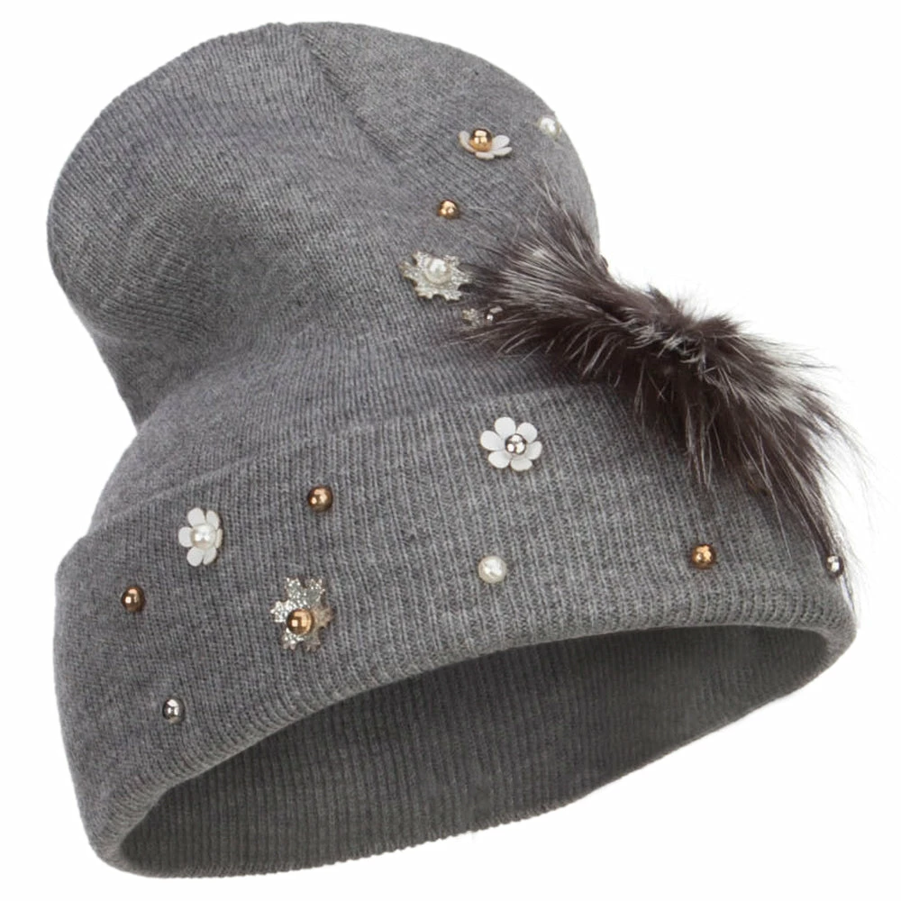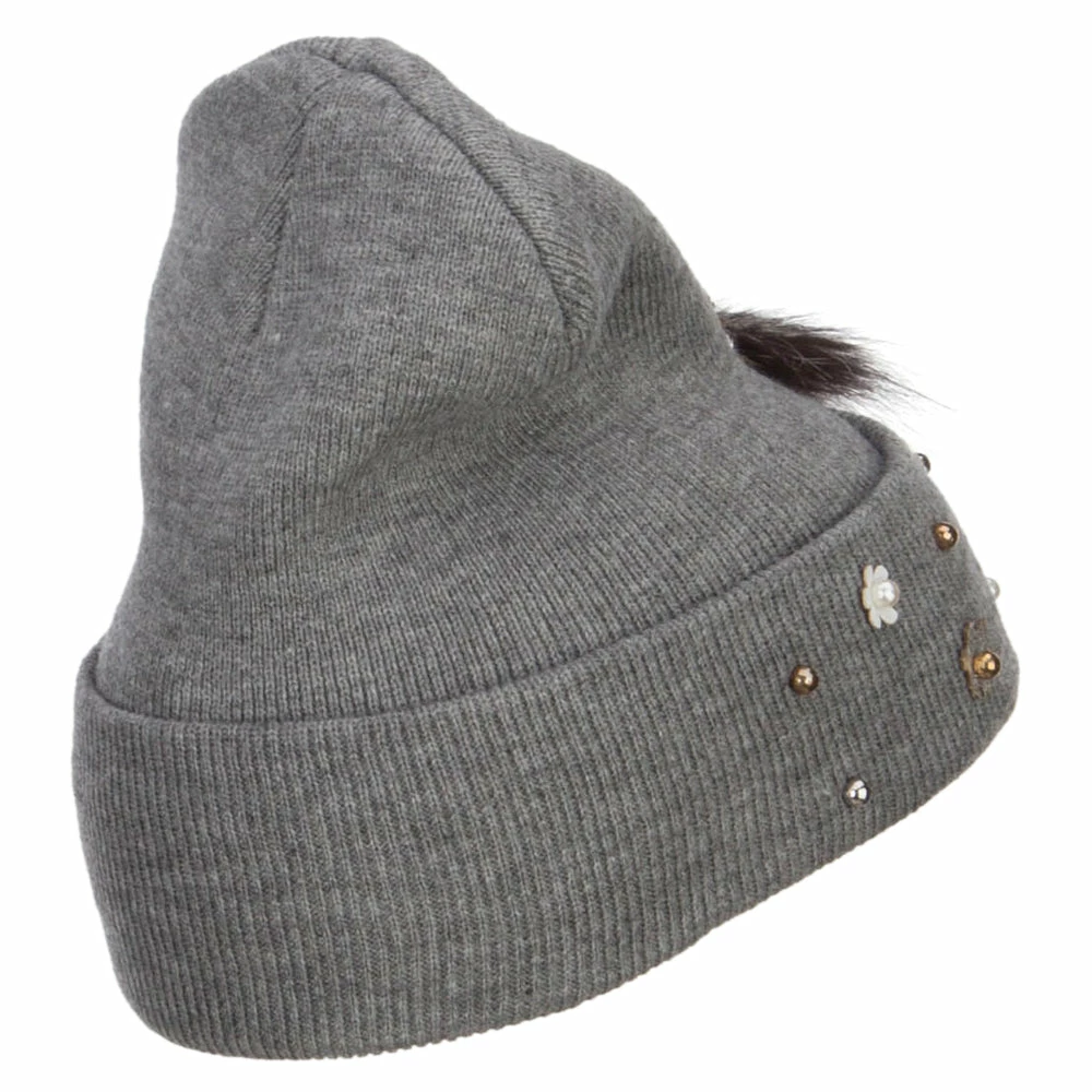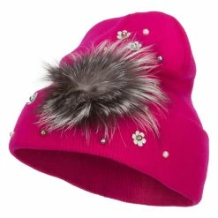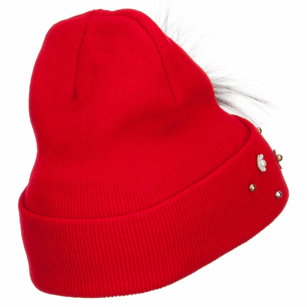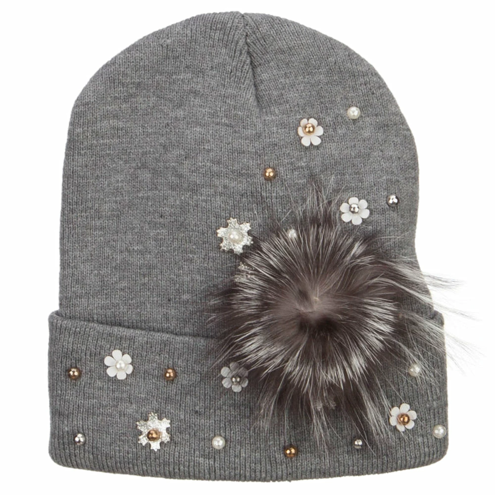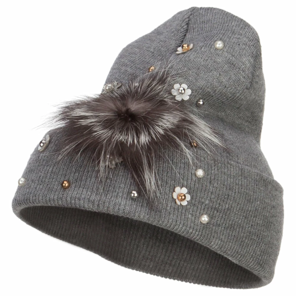 Fur accented knit long beanie hat for ladies.