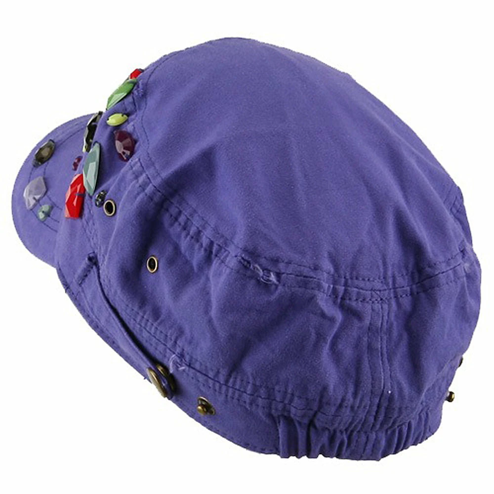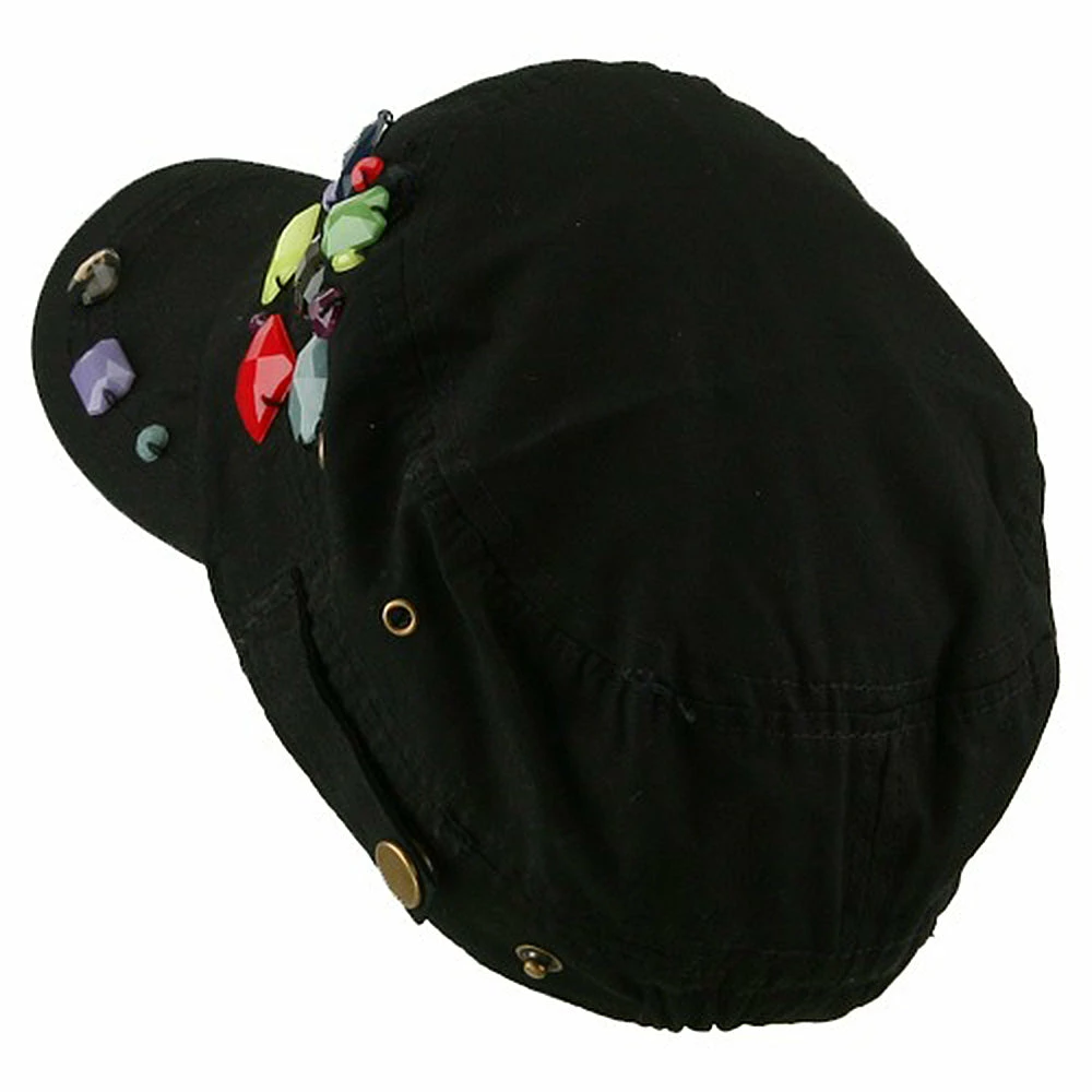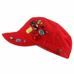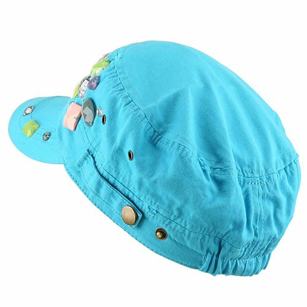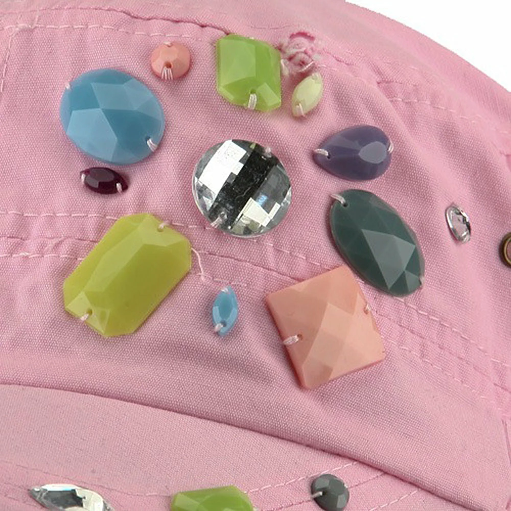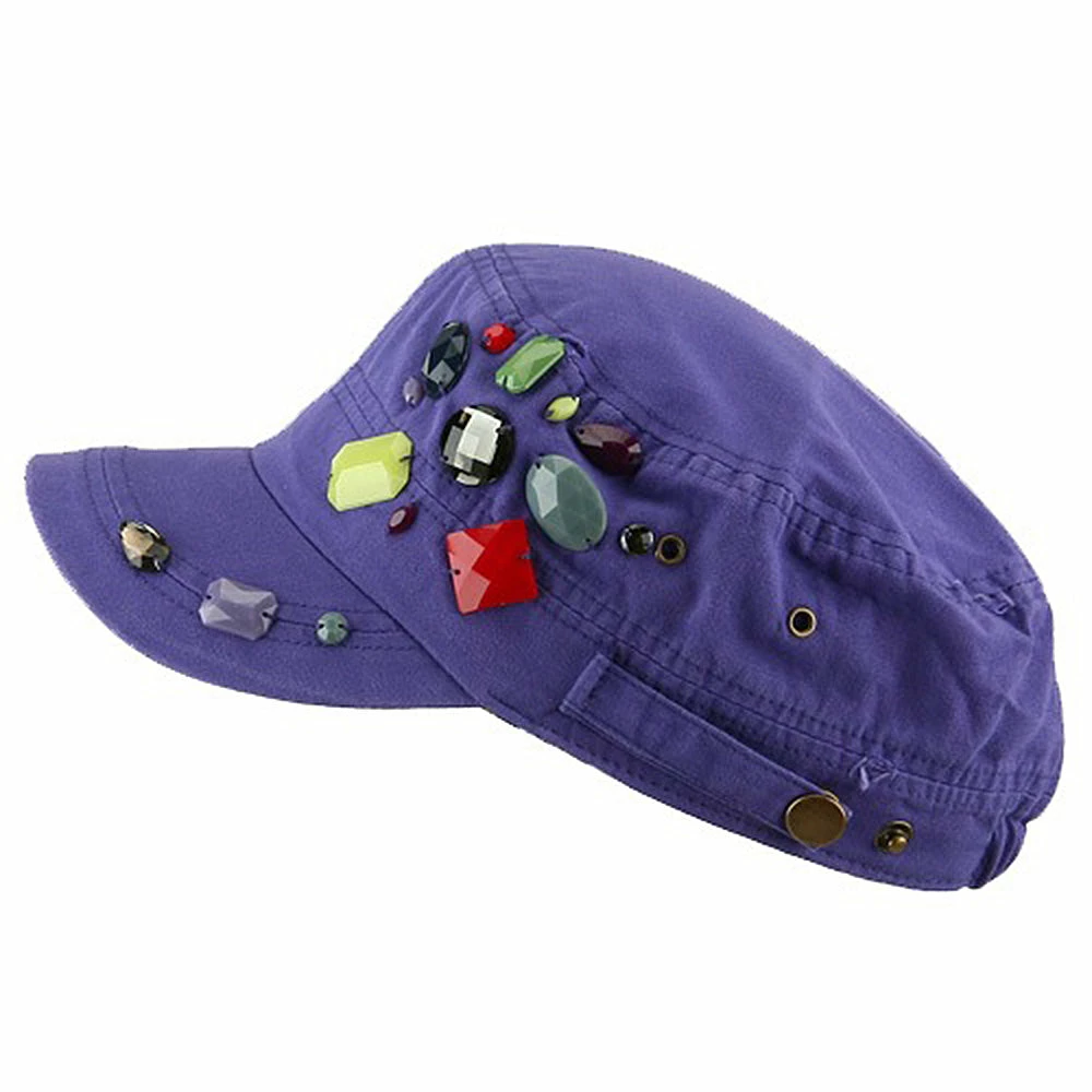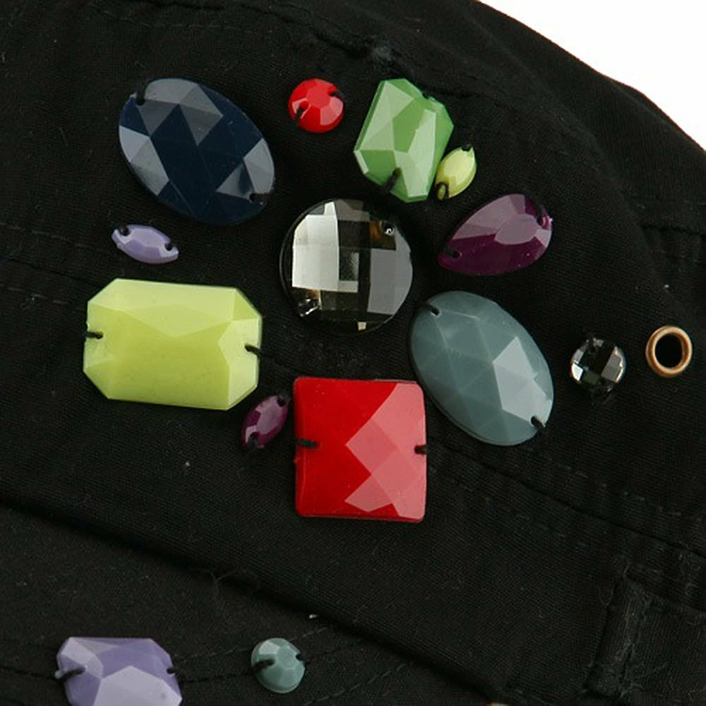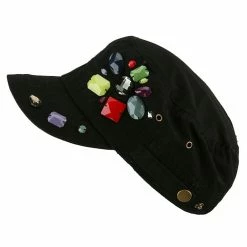 OurScattered Colored Gem Cap is just fabulous jeep style army cap that will get all the people’s attention with this visually stunning look this hat is featuring.On the solid color ofjeep style army cap, decoration gems are attached on the side of hat, offering unique style of look.Made from 100% cotton and with fully lined inside, this cap features 3 inches crown and 2 1/4 inches long pre-curved bill and same color is featured under the bill as well.This hat is designed to fit almost any head types as it comes in one size with elastic band closure hidden in the back.You will look fashionable for sure with trying this wonderful cap.