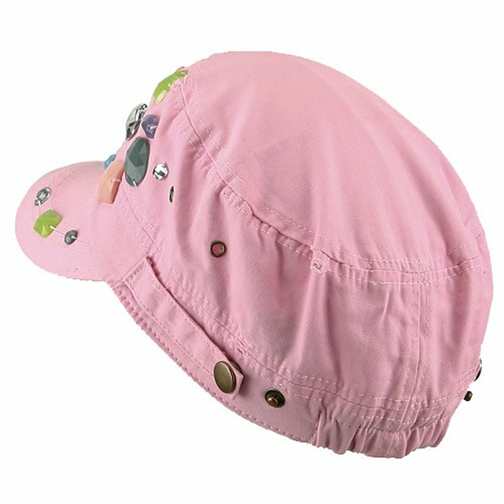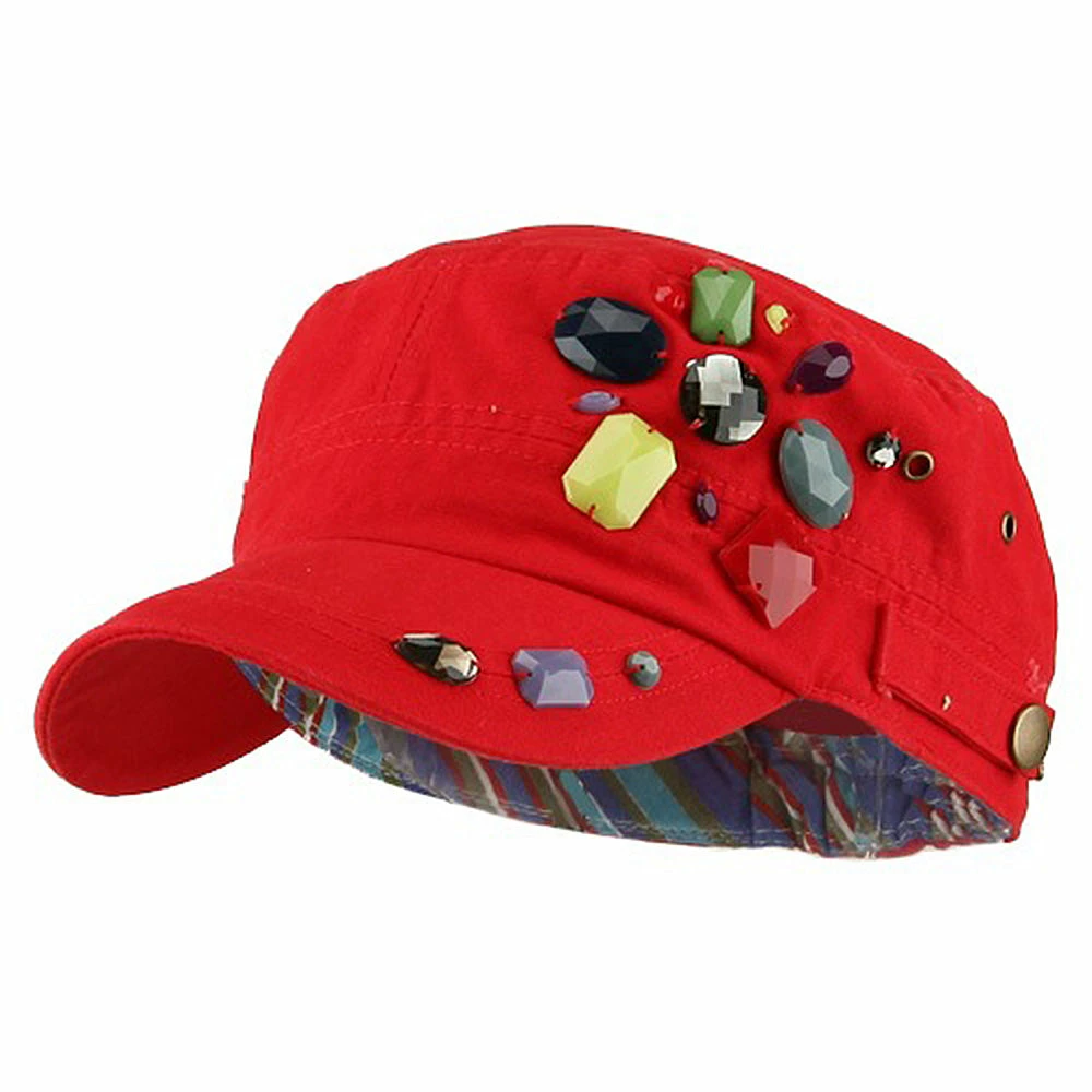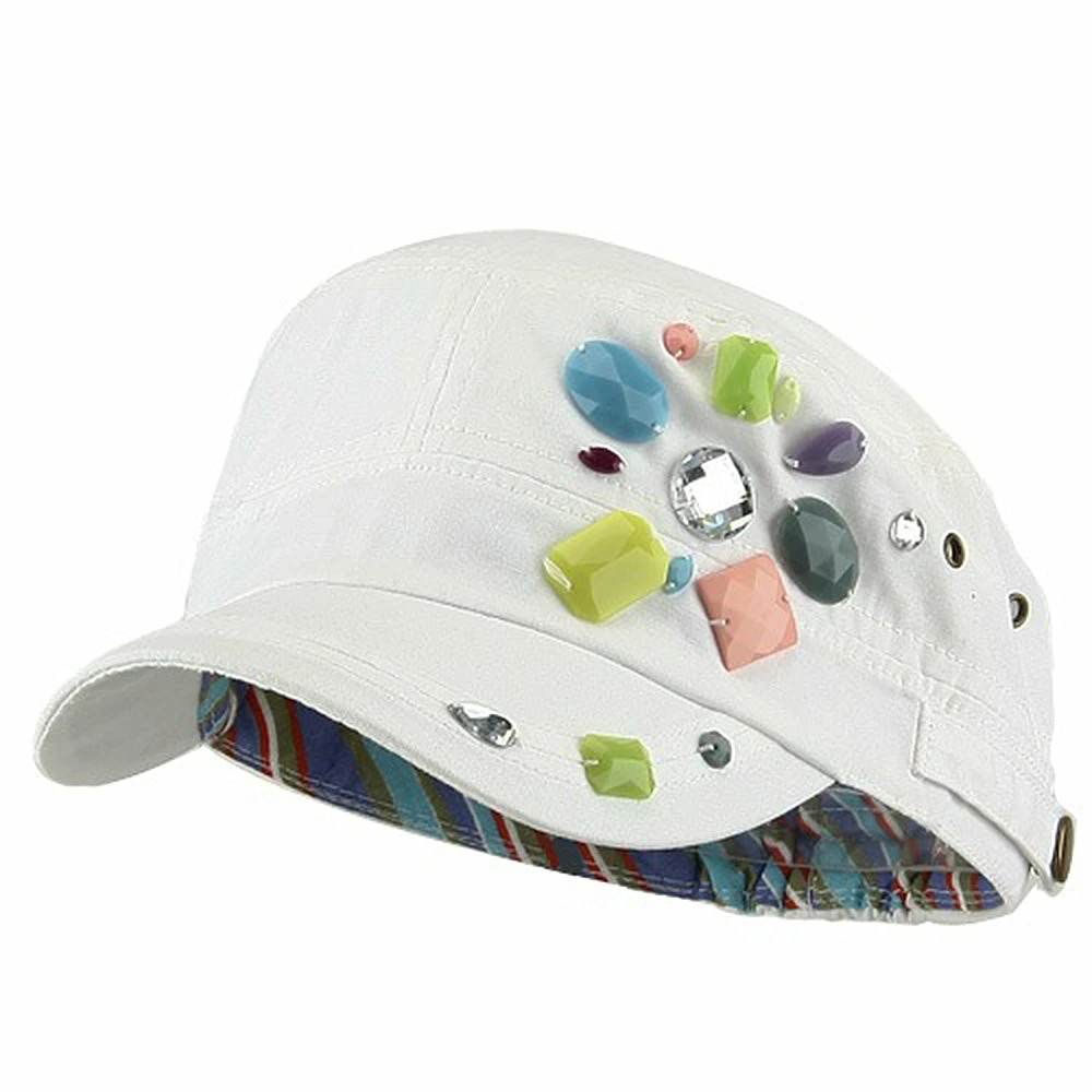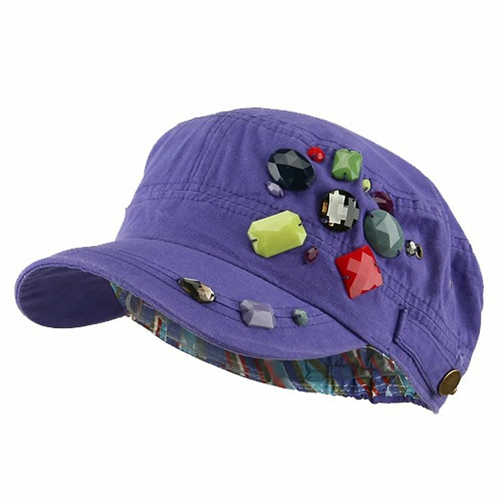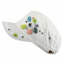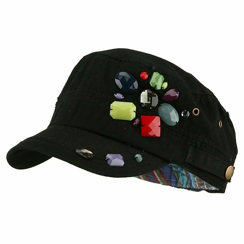 OurScattered Colored Gem Cap is just fabulous jeep style army cap that will get all the people’s attention with this visually stunning look this hat is featuring.On the solid color ofjeep style army cap, decoration gems are attached on the side of hat, offering unique style of look.Made from 100% cotton and with fully lined inside, this cap features 3 inches crown and 2 1/4 inches long pre-curved bill and same color is featured under the bill as well.This hat is designed to fit almost any head types as it comes in one size with elastic band closure hidden in the back.You will look fashionable for sure with trying this wonderful cap.