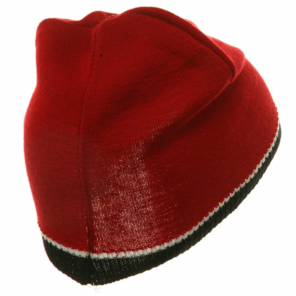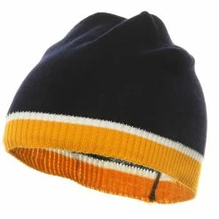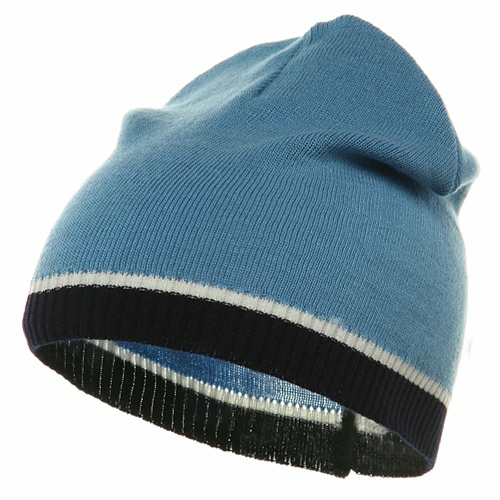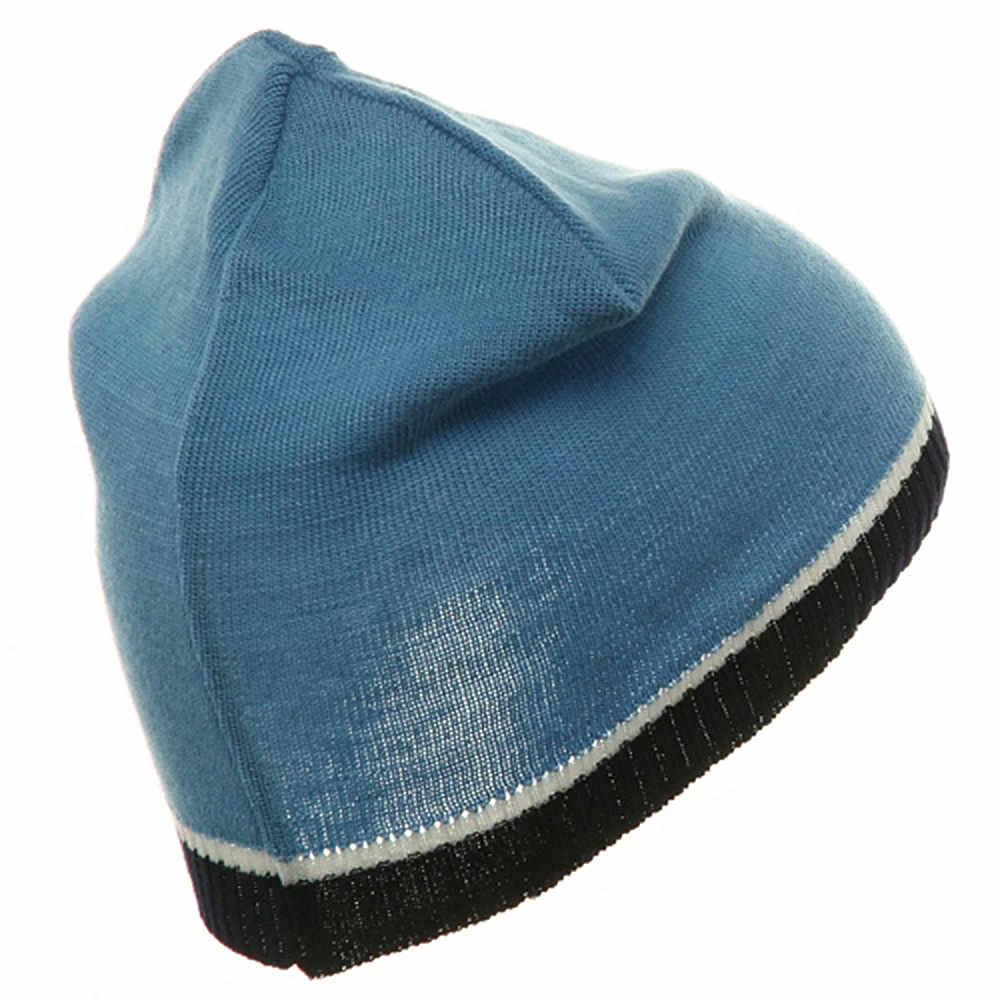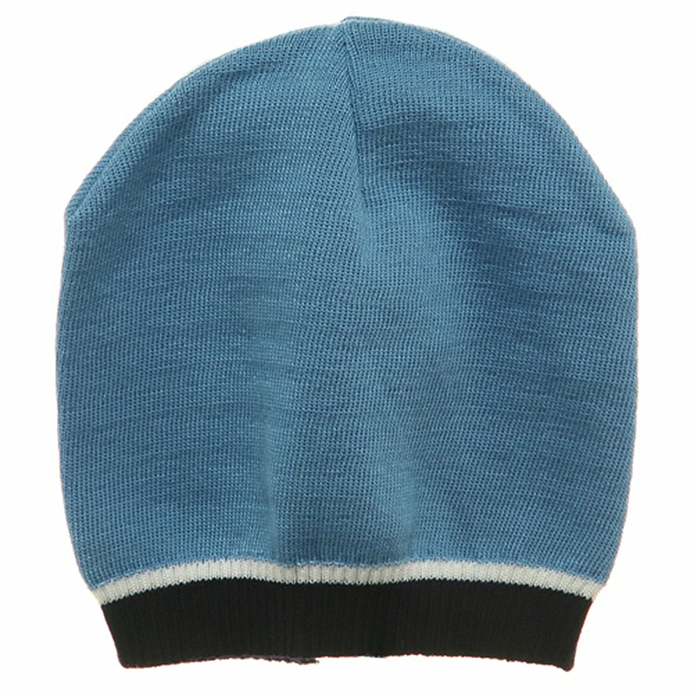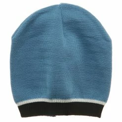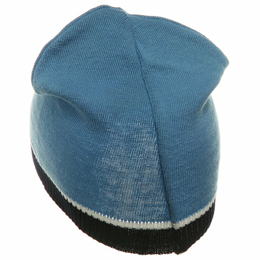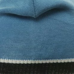 This beautifully simple, slim three color beanie will serve you well throughout the fall and winter. Constructed out of 1 panel of fine acrylic knit, with 1 seam running down the back, this beanie offers extreme stretch and flexibility for a great fit for any head shape. The body of the hat is a bright clear blue with stripes of white and rich navy blue accenting the finely ribbed opening. Lightweight and thin, the soft beanie will easily fit into your smallest pocket for easy travel and warm protection.